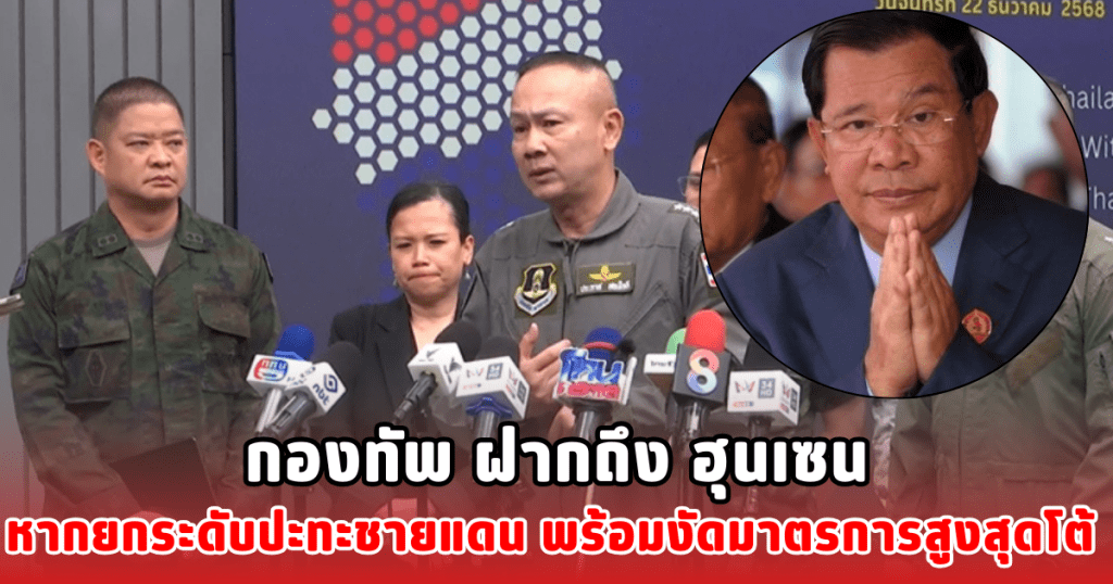 วันที่ 22 ธันวาคม 2568 ที่ศูนย์แถลงข่าวร่วมสถานการณ์ไทย-กัมพูชา พล.อ.อ.ประภาส สอนใจดี ผู้ช่วยผู้บัญชาการทหารอากาศ ในฐานะผู้อำนวยการศูนย์แถลงข่าวฯ กล่าวถึงกรณี สมเด็จฮุน เซน ประธานวุฒิสภากัมพูชา ออกมาแสดงท่าทีและส่งสัญญาณถึงยุทธศาสตร์ความขัดแย้งระยะยาวกับประเทศไทยว่า ประเด็นดังกล่าวถือเป็นเรื่องที่ต้องให้ความสำคัญ เนื่องจากเป็นถ้อยแถลงจากผู้นำระดับสูงของกัมพูชา ซึ่งมีลักษณะสร้างความเชื่อและการมีส่วนร่วมภายในประเทศของตนเอง