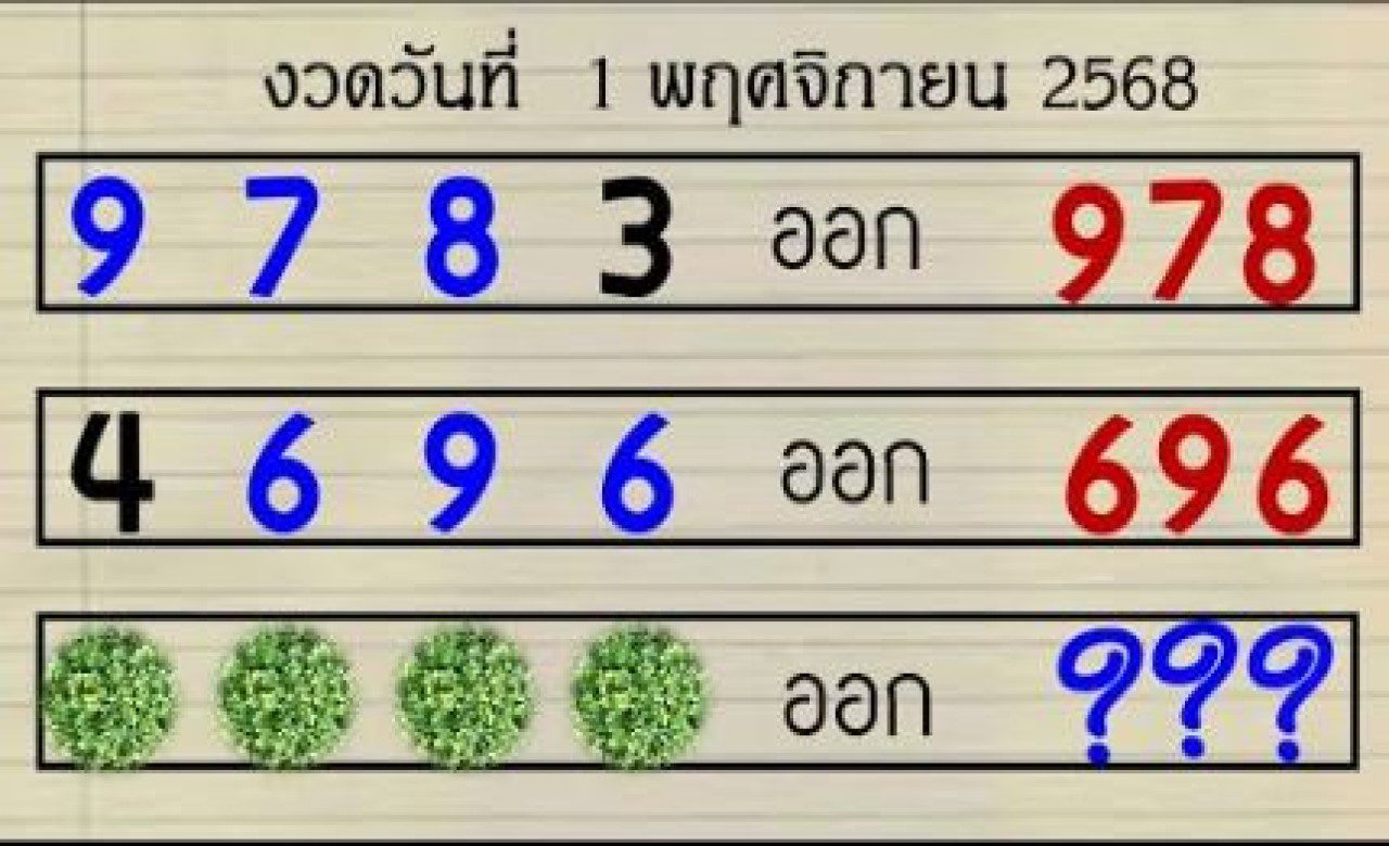 978*696!!ถ่ายทอดสดหวย มาแล้วใครรอ..ชุด3ตัว พิเศษ จัดให้ตรุงๆ งวด 1 พฤศจิกายน 2568
